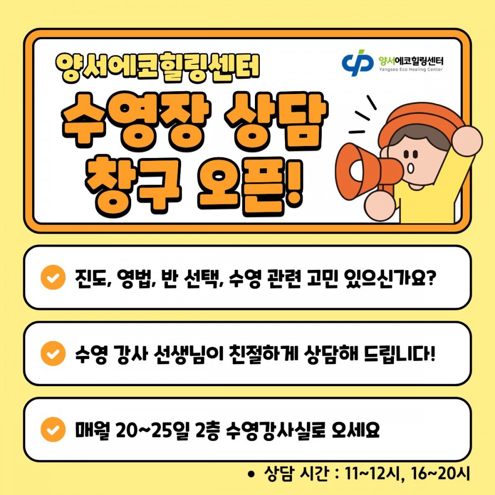 양서에코힐링센터 수영장 상담 창구를 오픈 하였으니 많은 관심 부탁드립니다.